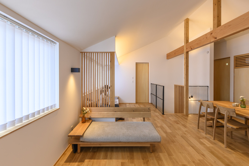 畳コーナーには腰を下ろせるベンチがあり、吹き抜けには高社山を見ながら本を読んだり、作業ができるカウンター、そして四季の移ろいを間近に感じられる、屋根付きのウッドデッキ。家のあちこちに散りばめられた居場所が、日々の暮らしに小さな楽しみを添えてくれます。