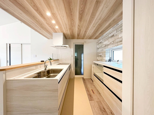 勝手口から直接家事スペースへとつながる動線を確保。買い物帰りにはスムーズに荷物を仕分けしながらキッチンへ運べるため、毎日の家事の負担を大きく軽減します。