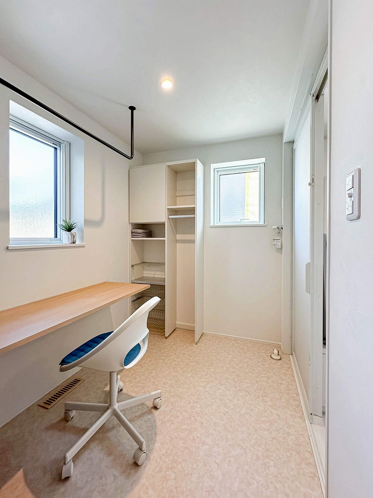 勝手口から直接家事スペースへとつながる動線を確保。買い物帰りにはスムーズに荷物を仕分けしながらキッチンへ運べるため、毎日の家事の負担を大きく軽減します。